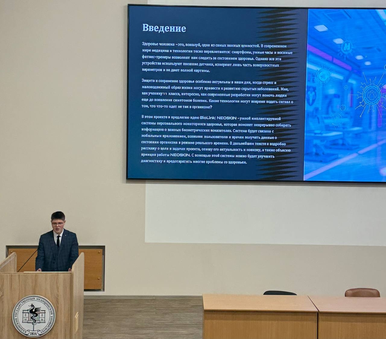 Никита үз проектын «Медицинада цифрлы технологияләр» номинациясендә тәкъдим итте. Ул сәламәтлекне шәхси мониторинглауның имплантацияләнә торган системасын уңышлы яклады: